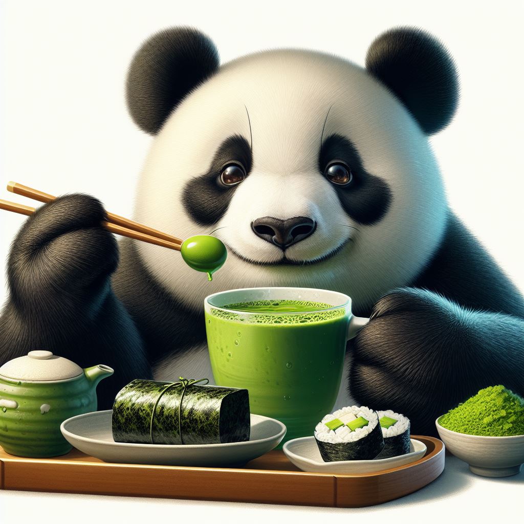 抹茶と海苔の日本の食文化を楽しんでいるパンダのイラスト写真